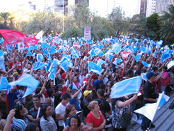 Nos arredores da Praça da Assembleia, cerca de 20 ônibus de viagem traziam centenas de pessoas de diferentes regiões de Minas Gerais que vieram endossar o evento. Claudinéia Soares veio da cidade de Simonésia, na zona da mata, com mais 15 pessoas para apoiar a paralisação. Mãe de 2 filhas cuja escola está em greve, ela conta que valeu a pena ter viajado 324 km para defender uma causa tão importante. “Viemos aqui para mostrar aos professores que eles têm o nosso apoio para manter a paralisação até que seus direitos sejam cumpridos!”