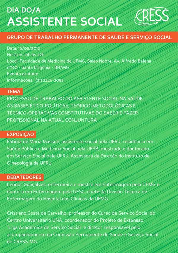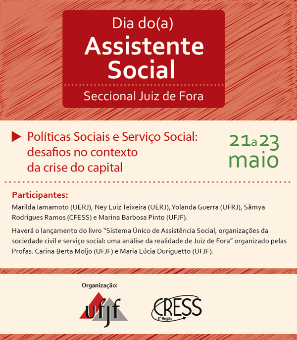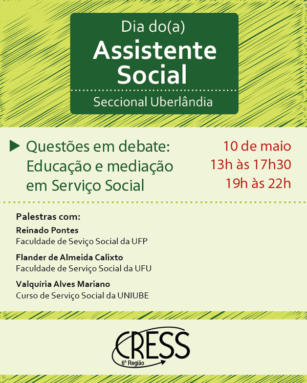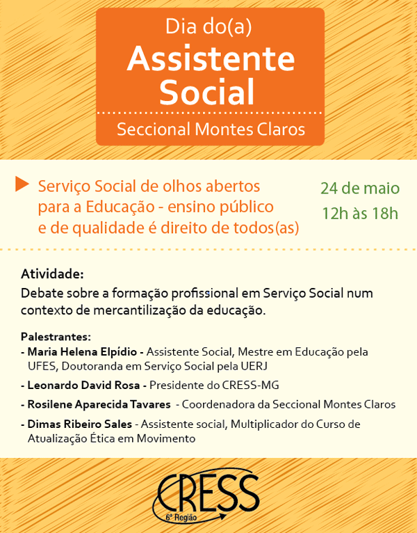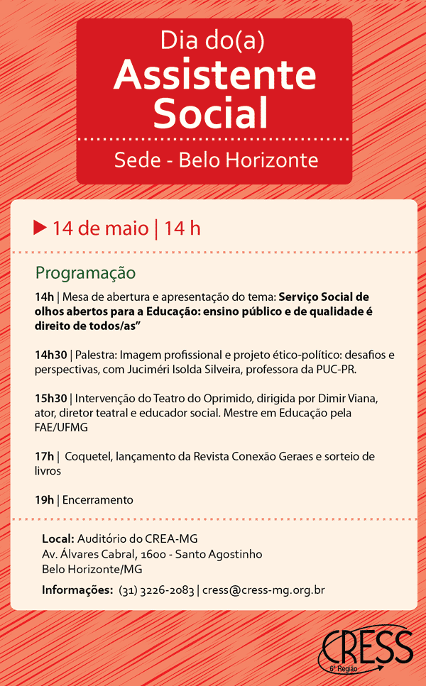 O CRESS-MG realizará eventos em comemoração ao Dia do/a Assistente Social, nas Seccionais e na Sede, durante este mês. Nos links abaixo, você pode conferir a programação completa das atividades e se inscrever.