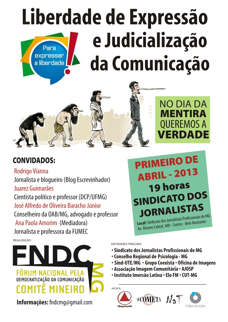 O evento será realizado no dia 1º de abril, segunda-feira, às 19 horas, no Sindicato dos Jornalistas Profissionais de Minas Gerais – SJPMG (Av. Álvares Cabral, 400. Centro). Aberto ao público, o encontro é uma iniciativa do Comitê Mineiro do Fórum Nacional pela Democratização da Comunicação (FNDC-MG).