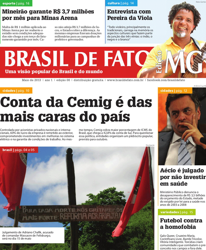 Sob forte emoção, a edição número zero do jornal Brasil de Fato edição tabloide Minas Gerais foi lançada, no dia 4 de maio, em Belo Horizonte. O lançamento aconteceu durante o Encontro Estadual de Formadores do Plebiscito Popular pela redução das tarifas de energia elétrica e do ICMS na conta de luz, que reuniu cerca de 700 pessoas vindas de mais de 100 cidades do estado. Assim, Minas Gerais torna-se o segundo estado a ter uma edição tabloide gratuita do Brasil de Fato, após o Rio de Janeiro, que desde o dia 1 de maio também conta com uma edição estadual (Clique na imagem para ampliá-la).