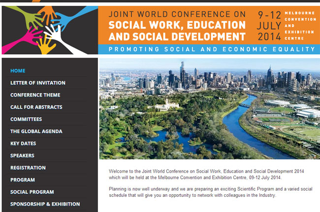Com o tema “Promover a igualdade social e econômica: respostas do serviço social e do desenvolvimento social”, a próxima conferência mundial promovida conjuntamente pela Associação Internacional de Escolas de Serviço Social (IASSW/AIETS), pelo Conselho Internacional de Bem-estar Social (ICSW) e pela Federação Internacional de Assistentes Sociais (FITS) ocorrerá entre 9 e 12 de julho em Melbourne (Austrália) e já está com inscrições abertas. O nome oficial do evento será Conferência Mundial Conjunta de Serviço Social, Educação e Desenvolvimento Social.