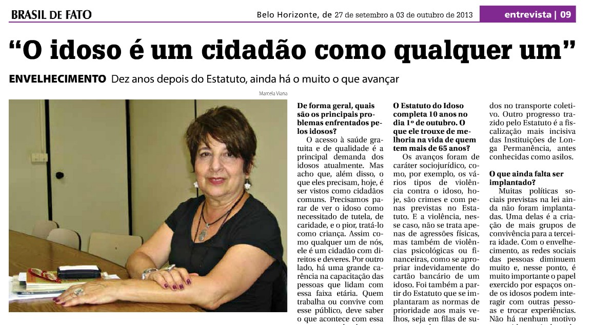 A última edição do semanário Brasil de Fato/MG traz uma entrevista com assistente social e coordenadora da Universidade Aberta ao Idoso, da PUC Contagem, Ruth Myssior. Na conversa, a especialista em envelhecimento fala sobre a atual situação das políticas públicas para quem tem mais de 65 anos e comenta se a sociedade e o Estado estão preparados para o envelhecimento que a população brasileira sofrerá nas próximas décadas.