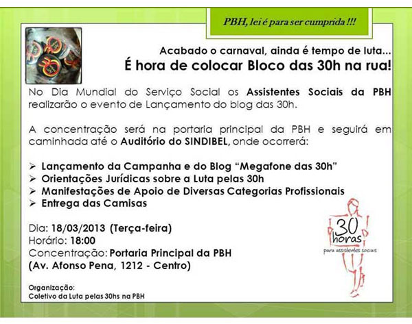 Amanhã, 18 de março, Dia Mundial do Serviço Social, às 18h, as/os Assistentes Sociais que trabalham na Prefeitura de Belo Horizonte (PBH) realizarão o evento de lançamento do Blog Megafone das 30 Horas.