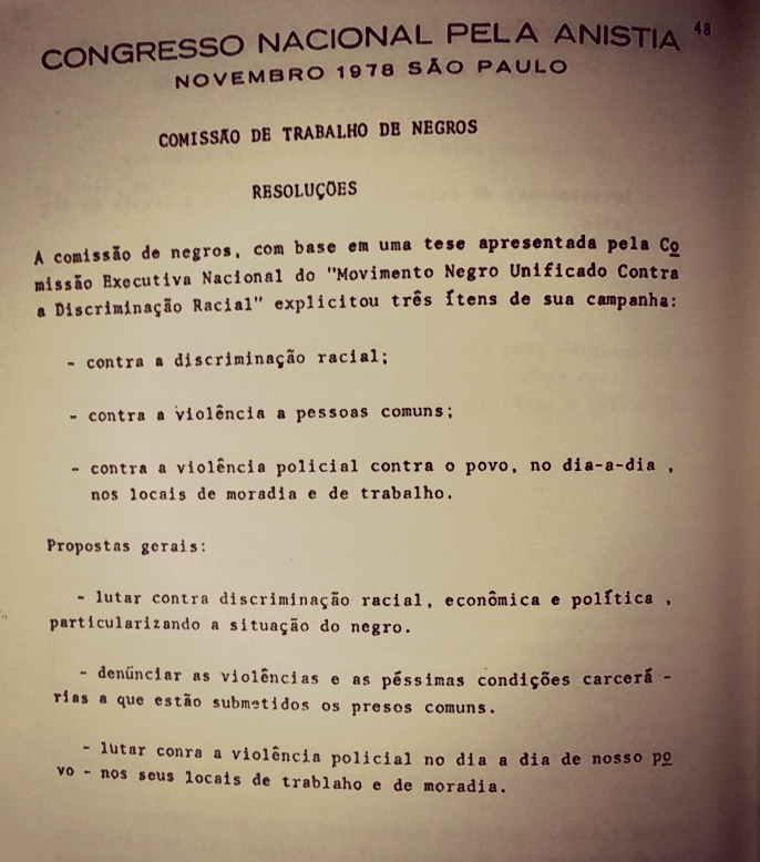 A militante lembra que a criação da principal organização de luta pelos direitos da população negra se deu em pleno regime militar, como forma de resposta às opressões vividas por esse segmento da população. Em 1978 surgia o Movimento Negro Unificado contra a Discriminação Racial. Nesse mesmo ano, durante o Congresso Nacional pela Anistia, em São Paulo, as propostas do MNU foram incorporadas ao Manifesto à Nação, como visto no trecho do documento: