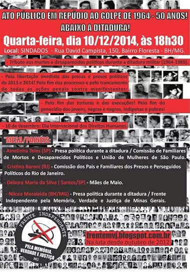 Na data em que se comemora o Dia dos Direitos Humanos, a Frente Independente pela Memória, Verdade e Justiça de Minas Gerais, da qual o CRESS-MG faz parte, promove em BH, na próxima quarta-feira, 10 de dezembro, um Ato Público em Repúdio ao Golpe de 1964.