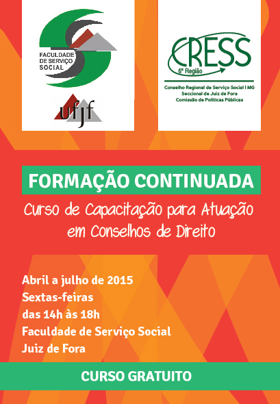 Atenção: curso quinzenal com 04 meses de duração (de abril a julho de 2015), totalizando 08 encontros. Curso realizado nas sextas-feiras, de 14 às 18h, na Faculdade de Serviço Social fa UFJF.