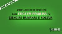 A ABEPSS, desde 2013 participa de um GT de Ciências Humanas e Sociais (CHS) da Comissão Nacional de Ética em Pesquisa do Conselho Nacional de Saúde do Ministério da Saúde – CONEP/CNS/MS, que tem a finalidade de elaborar uma normativa específica para a área de ética em pesquisa nas ciências humanas e sociais.