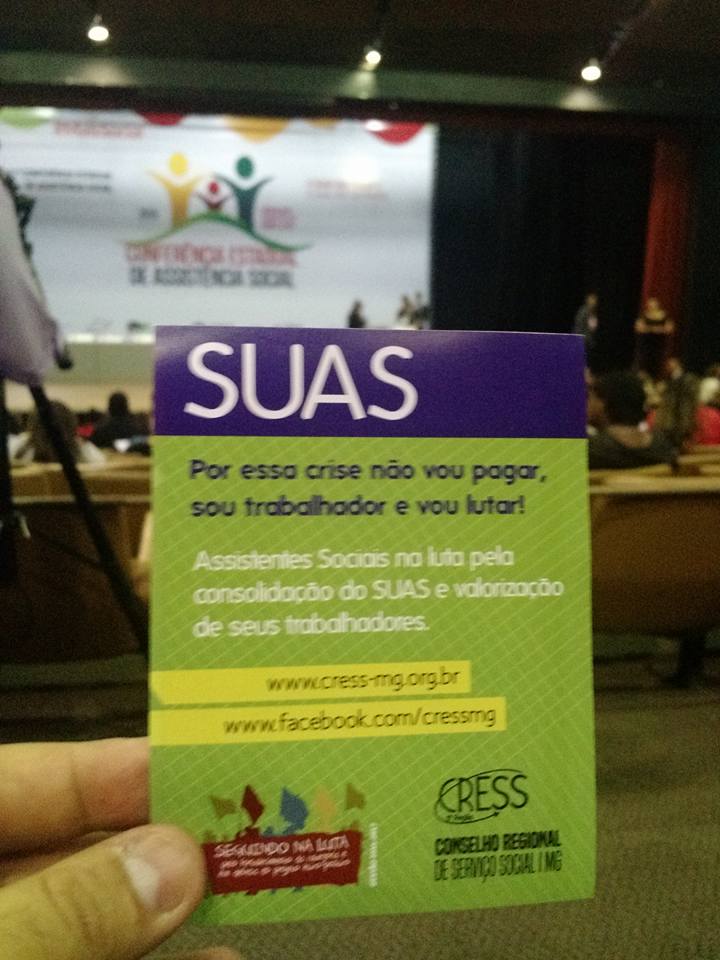 A 11ª Conferência Estadual de Assistência Social foi realizada em Belo Horizonte, entre os dias 26 e 29 de outubro, para avaliar os dez anos de implantação do Sistema Único de Assistência Social (SUAS) e definir as diretrizes da política de assistência social. O evento teve, mais uma vez, um significado político importante, pois completa a sua décima primeira edição com forte participação de trabalhadores/as. Na oportunidade, os representantes do CRESS-MG distribuíram uma cópia da carta enviada em janeiro ao Governo de Minas reivindicando o cumprimento das 30 horas.