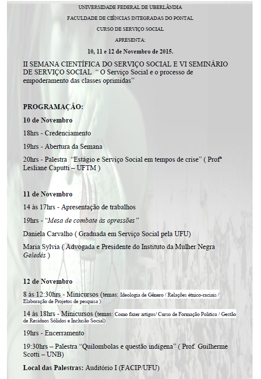 O curso de Serviço Social da Universidade Federal de Uberlândia (UFU) promove, entre os dias 10 e 12 de novembro, a II Semana Científica do Serviço Social e o VI Seminário de Serviço Social, com o tema “O Serviço Social e o processo de empoderamento das classes oprimidas”. A atividade será realizada na Faculdade de Ciências Integradas do Pontal e a programação será composta por palestras, apresentações de trabalhos e minicursos. Entre os temas que serão abordados, destaque para estágio em tempos de crise, combate às opressões e quilombolas e questão indígena.