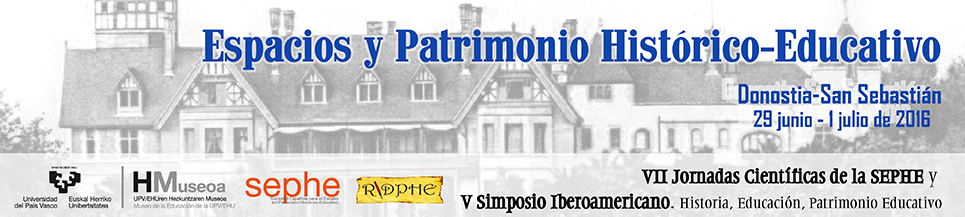 Estão abertas as inscrições para submissão de trabalhos para o Encontro “Espacios y Patrimonio Histórico Educativo", que será realizado entre 29 de junho e 1º de julho de 2016, na Universidad del País Vasco – Euskal Herriko Unibertsitatea, em Bilbau, na Espanha. O evento vai reunir a VII Jornadas Científicas de la SEPHE (Sociedad Española para el Estudio del Patrimonio Histórico–Educativo) e o V Simpósio Iberoamericano para a Investigação e a Difusão do Patrimônio Histórico Educativo – RIDPHE. O tema desta edição é “Universidade Inovadora por um Desenvolvimento Humano Sustentável”.