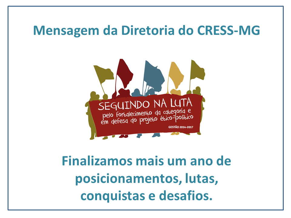 A gestão “Seguindo na Luta: pelo fortalecimento da categoria em defesa do projeto ético-político (2014-2017)” segue em frente e reafirma o seu compromisso com a categoria do Estado de Minas Gerais de continuar sempre na luta para o fortalecimento do seu projeto ético-político. E no que toca as lutas mais gerais da sociedade, reafirmamos o nosso compromisso com um padrão de proteção social amplo, conforme está preconizado na Carta de Maceió e reafirmado no Encontro Nacional de Seguridade Social realizado este ano, em Belo Horizonte, e que assegure os princípios de universalidade, cidadania, democracia e justiça social no atendimento socioassistencial.