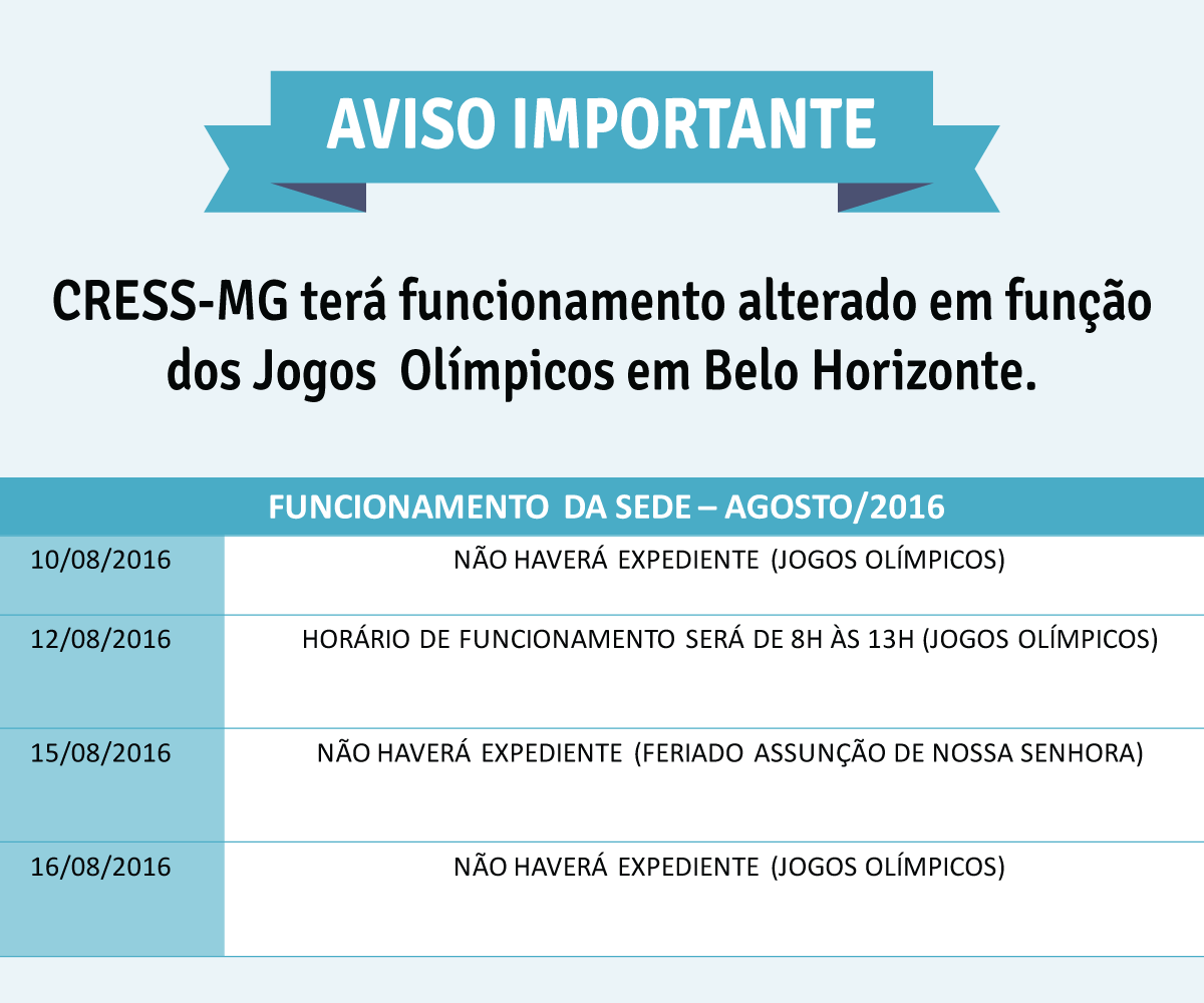 Conforme recomendação da Comissão Estadual de Segurança Pública e Defesa Civil para os Jogos Olímpicos, visando contribuir com a segurança pública e com a mobilidade urbana, o funcionamento do CRESS 6ª Região será alterado.
