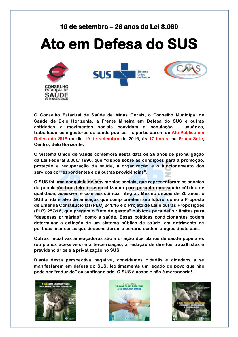 BH terá Ato Nacional em Defesa da Saúde Pública Brasileira
