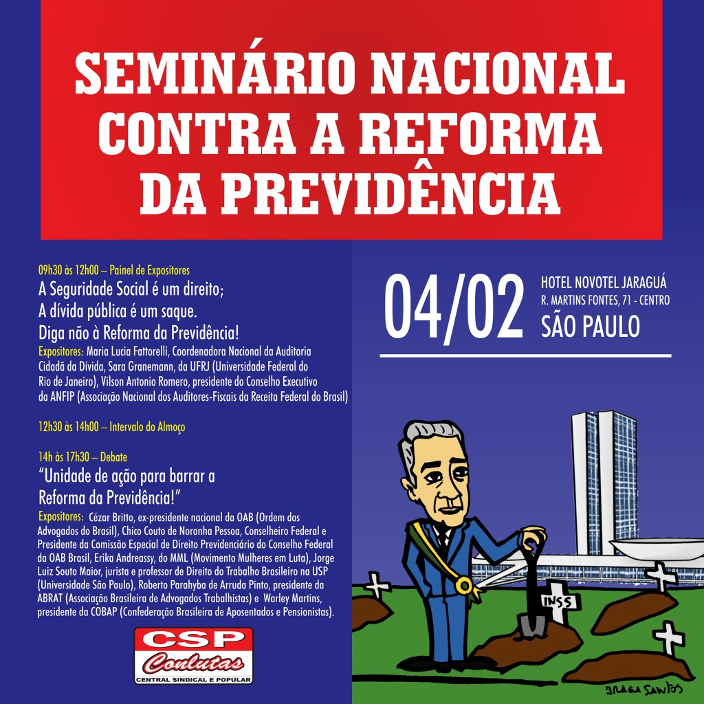 Com o anúncio da Reforma da Previdência do governo Temer, que deve acabar com as aposentadorias e pensões, a mobilização da classe trabalhadora, dos movimentos e entidades sindicais é urgente e mais que necessária. Por isso, para discutir o tema e organizar nosso enfrentamento a mais este ataque, a CSP-Conlutas, que já inicia uma ampla campanha sobre o assunto, realizará o Seminário Nacional contra a Reforma da Previdência, que acontecerá em São Paulo, no dia 4 de fevereiro.