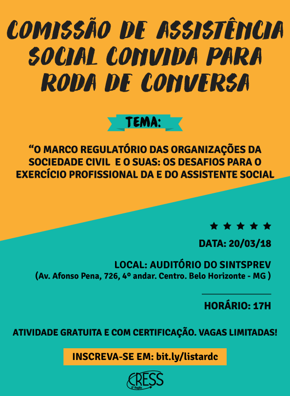 A palestra “O MARCO REGULATÓRIO DAS ORGANIZAÇÕES DA SOCIEDADE CIVIL E O SUAS: OS DESAFIOS PARA O EXERCÍCIO PROFISSIONAL DA E DO ASSISTENTE SOCIAL", acontecerá em novo local. Devido ao grande interesse e adesão da categoria, o CRESS-MG promoverá o evento no auditório do Sintsprev (espaço maior, que possibilita a abertura de novas vagas para participação).