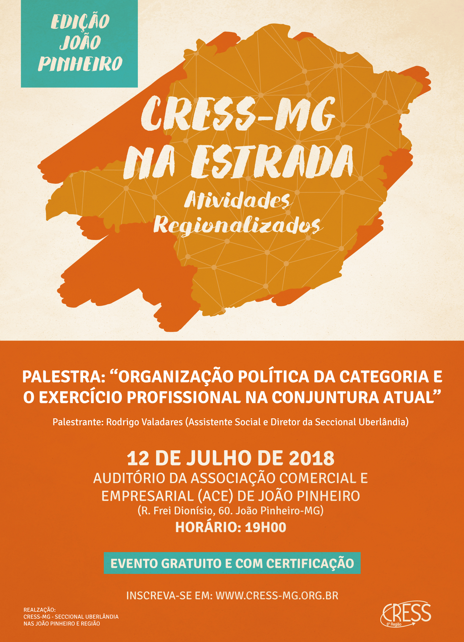 No dia 12 de julho, o Projeto CRESS-MG na Estrada – Atividades Regionalizadas estará na cidade de João Pinheiro. A iniciativa é uma resposta aos desafios da extensão territorial e do expressivo número de municípios em Minas Gerais, buscando conceder mais capilaridade às atividades formativas e com o intuito de alcançar um maior número de profissionais que atuem em regiões para além daquelas onde se situam a Sede, em Belo Horizonte, e as Seccionais, em Juiz de Fora, Montes Claros e Uberlândia.