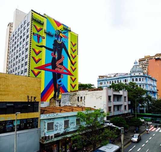 Moradora de uma comunidade em BH, a artista Criola foi uma das autoras das artes pintadas em prédio do Circuito Urbano de Arte (Cura) que realizou sua segunda edição este mês. Foto: Instagram do evento.