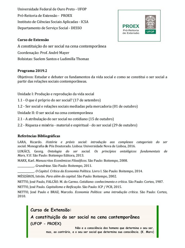 Objetivos: Estudar e debater os fundamentos da vida social e como se constitui o ser social a partir das relações sociais contemporâneas.