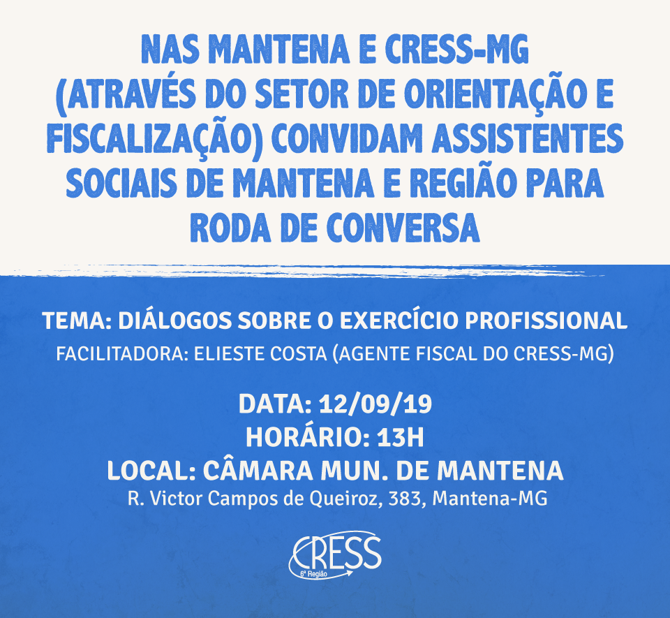 NAS Mantena e CRESS-MG (através do Setor de Orientação e Fiscalização) convidam assistentes sociais de Mantena e região para roda de conversa