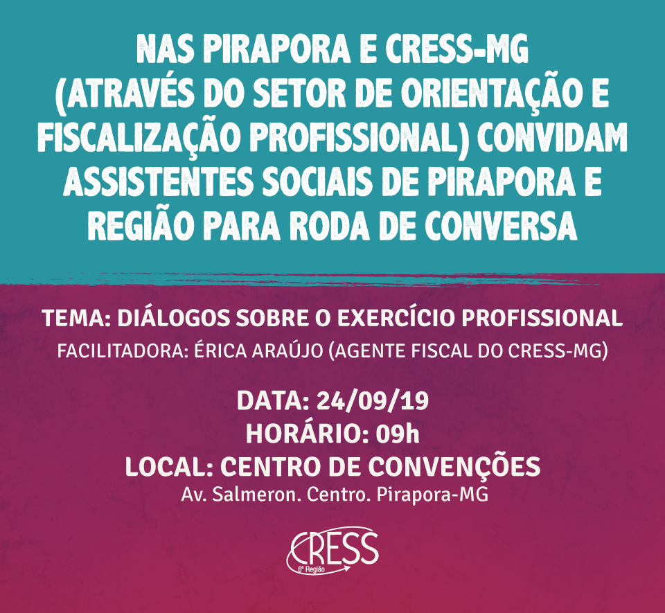 NAS Pirapora e CRESS-MG (através do Setor de Orientação e Fiscalização) convidam assistentes sociais de Pirapora e região para roda de conversa