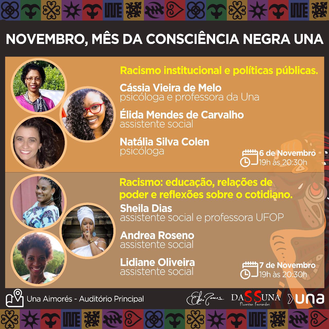 Para estreia das atividades, apresentamos a realização de dois painéis e rodas de conversas sobre os temas: "Racismo institucional e políticas públicas" no dia 06/11, de 19:00h às 20:30h, tendo como convidadas: Cássia Vieira de Melo, psicóloga e professora Una; Élida Mendes de Carvalho, assistente social e Natália Silva Colen, psicóloga.