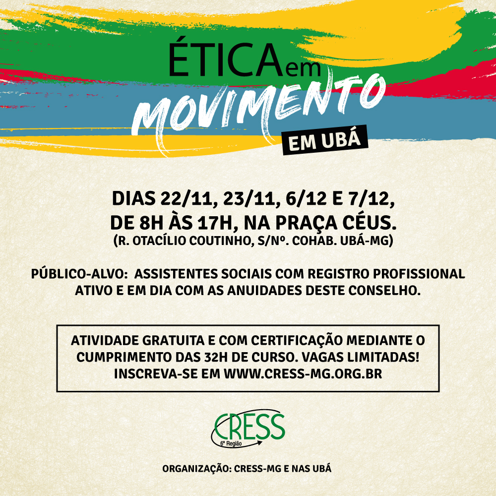 Os retrocessos vividos no país revelam para as e os assistentes sociais a necessidade em reafirmar o compromisso com a liberdade e a garantia dos direitos da classe trabalhadora. Diante deste cenário, o CRESS-MG realiza a segunda edição de 2019 do Curso Ética em Movimento, na cidade de Ubá-MG.