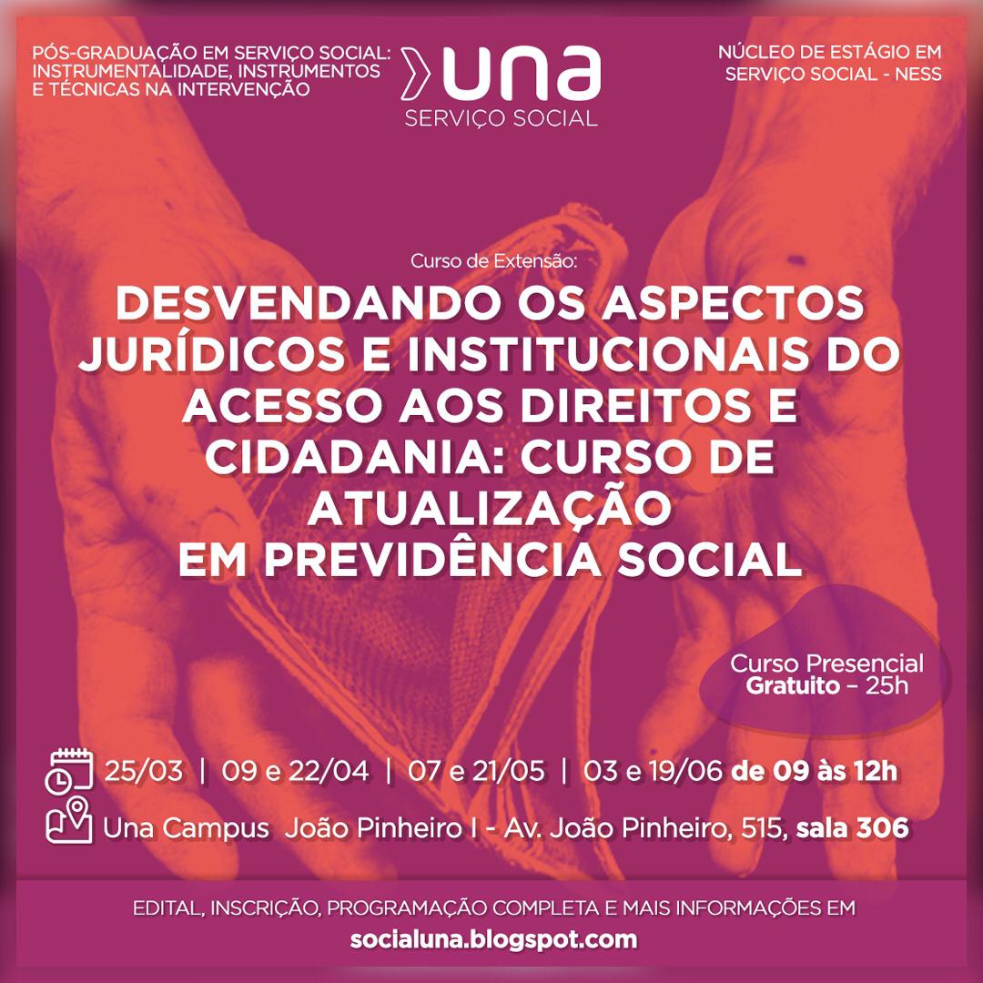 O Centro Universitário UNA por meio do Curso de graduação em Serviço Social, Núcleo de Estágio em Serviço Social (NESS) e do Curso de Pós-Graduação em Serviço Social: Instrumentalidade, Instrumentos e Técnicas na Intervenção torna público a oferta do Curso de extensão: “‘Desvendando os aspectos jurídicos e institucionais do acesso aos direitos e cidadania: curso de atualização em previdência social” totalmente gratuito para comunidade do Serviço Social e demais interessadas (os).