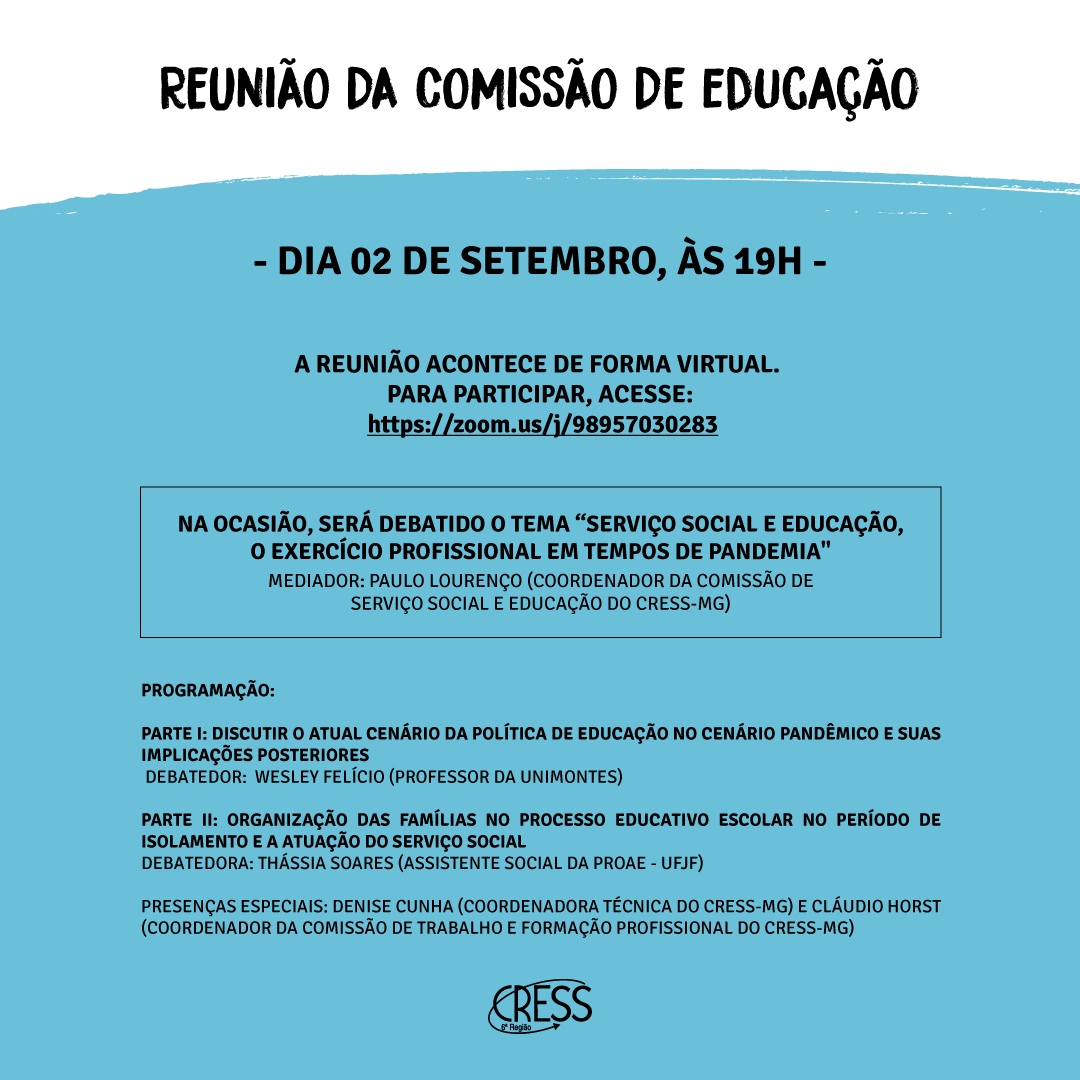 A reunião online da Comissão de Educação do CRESS-MG acontece no dia 02 de setembro, às 19h.