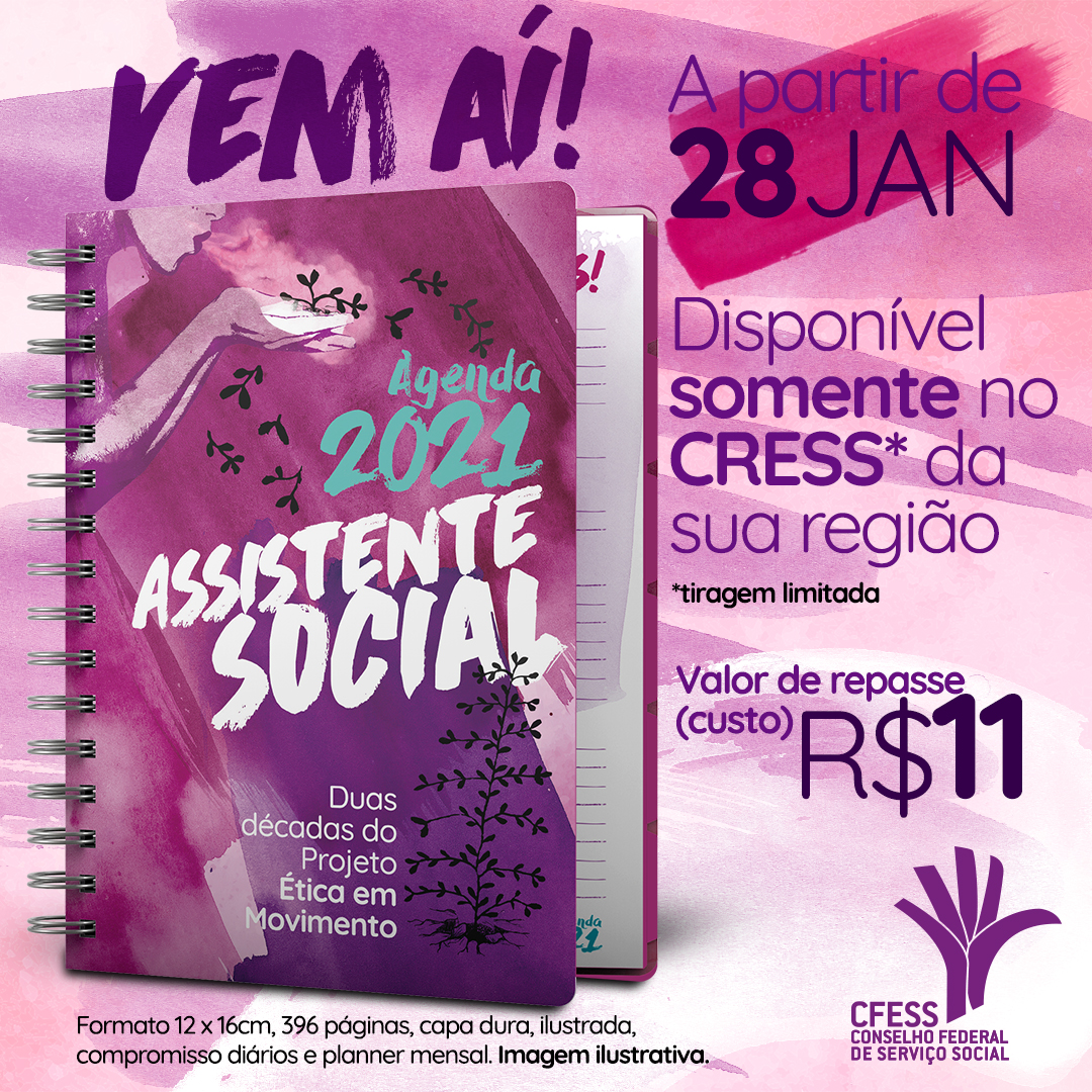 A Agenda, além de instrumento para marcar compromissos diários e mensais, com calendários, espaços para anotações e datas importantes, segue sendo referência para pesquisa cotidiana, repleta de conteúdo que dialoga com o trabalho da categoria, por meio de textos, entrevistas, pílulas e conteúdo poético. Ou seja, a Agenda Assistente Social 2021 é também um material para qualificação profissional e de divulgação da profissão, com textos que contribuem para reflexões e discussões para o dia-a-dia!