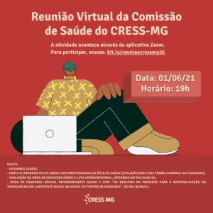 Participe, na próxima terça-feira, da reunião da Comissão de Saúde do CRESS-MG!