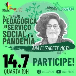 Para ampliar o debate com a categoria de assistentes sociais sobre questões atuais ligadas à atuação profissional, o CFESS lançará uma nova série de lives especiais: diálogos do cotidiano profissional. A primeira transmissão da série ocorrerá no dia 14 de julho, a partir das 19h, e terá como tema “A dimensão pedagógica do Serviço Social e a pandemia”, com a professora da Universidade Federal de Pernambuco (UFPE) e assistente social Dra. Ana Elizabete Mota.