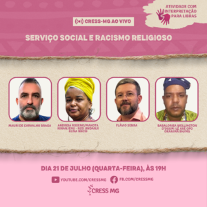 Na próxima quarta-feira, 21 de julho, o CRESS-MG promove mais uma live, através da Comissão de Direitos Humanos, com o tema Serviço Social e Racismo Religioso.