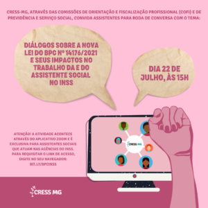 Se você é assistente social e atua nas agências do INSS, participe da roda de conversa do CRESS-MG na próxima quinta-feira (22/07), às 15h.