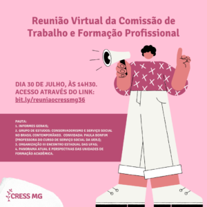 Na próxima sexta-feira, 30/07, acontece mais uma reunião da Comissão de Trabalho e Formação Profissional do CRESS-MG e você é nossa/o convidada/o especial