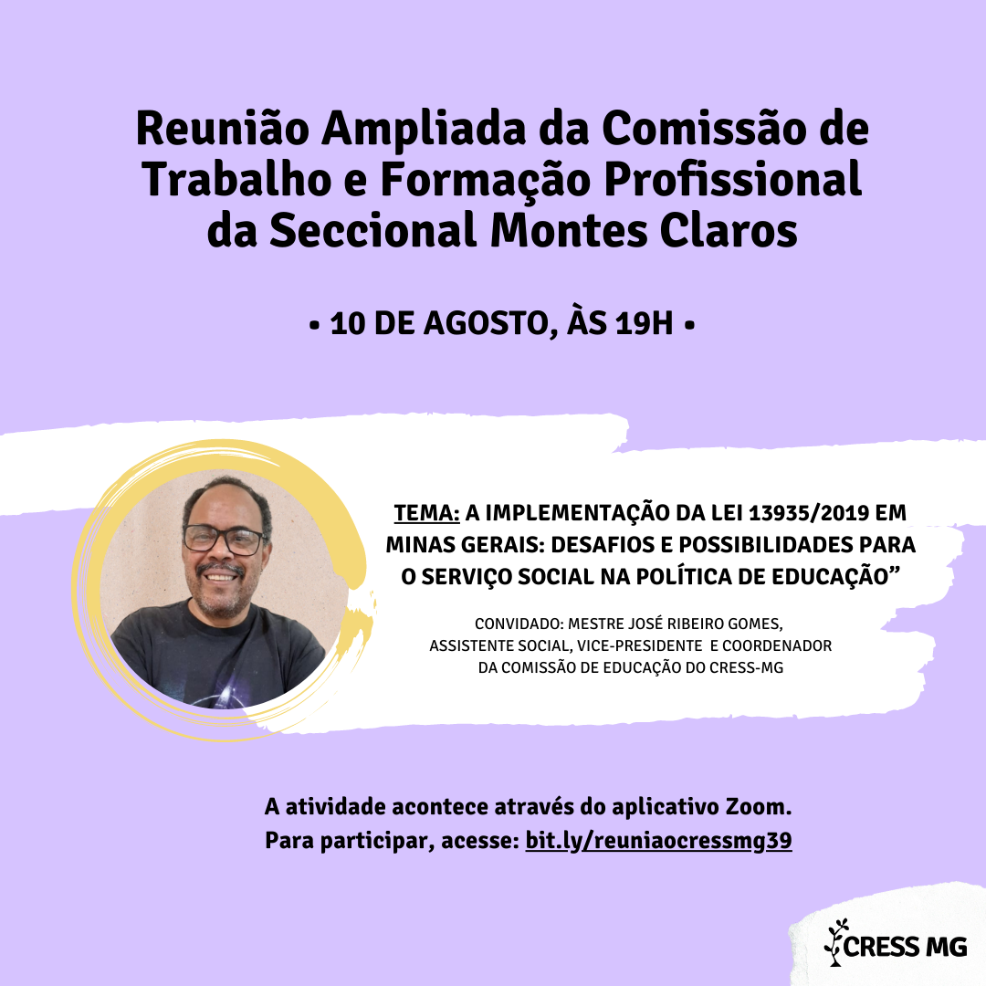 A Implementação da Lei 13935/2019 em Minas Gerais: Desafios e Possibilidades Para o Serviço Social na Política de Educação é o tema da próxima reunião ampliada da Comissão de Trabalho e Formação Profissional da Seccional Montes Claros.