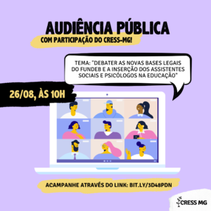 Nesta quinta-feira (26/8), às 10h, o CRESS-MG participa da audiência pública na Assembleia Legislativa de Minas Gerais sobre as novas bases legais do Fundeb e a inserção de assistentes sociais e psicólogas/os na educação.