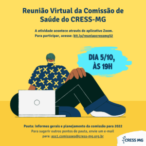 No dia 5/10, às 19h, tem reunião da Comissão de Saúde do CRESS-MG, que é aberta a toda a categoria.