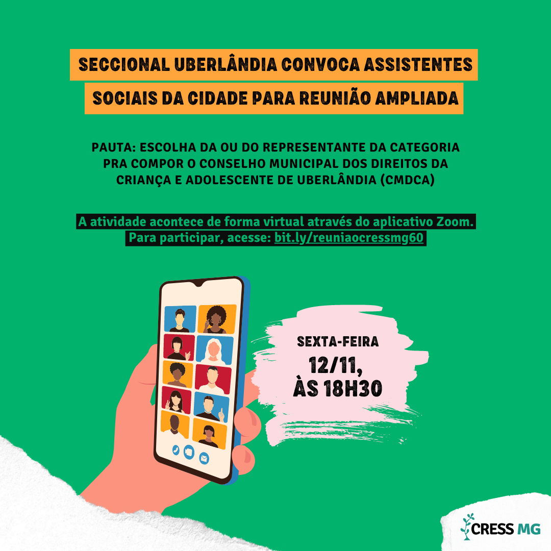A Seccional Uberlândia do CRESS-MG convoca a todas e todos os assistentes sociais que atuam em Uberlândia para participarem da reunião ampliada virtual, nesta sexta (12/11), às 18h30.