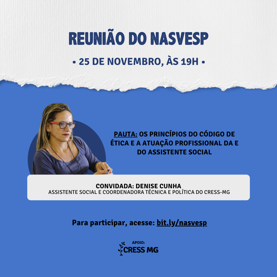 Na ocasião, o NAS convida a coordenadora técnica e política do CRESS-MG, Denise Cunha, para facilitar o debate sobre o tema Os Princípios do Código de Ética e a Atuação Profissional da e do Assistente Social.