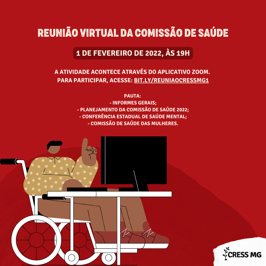 Nesta terça (01/02), às 19h, acontece a primeira reunião de 2022 da Comissão de Saúde do CRESS-MG e você é nossa/o convidada/o especial!