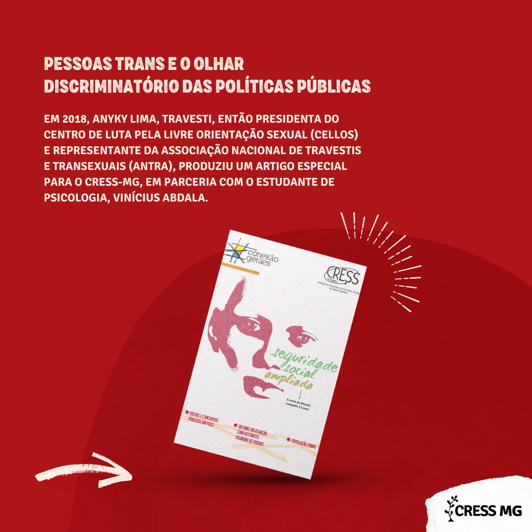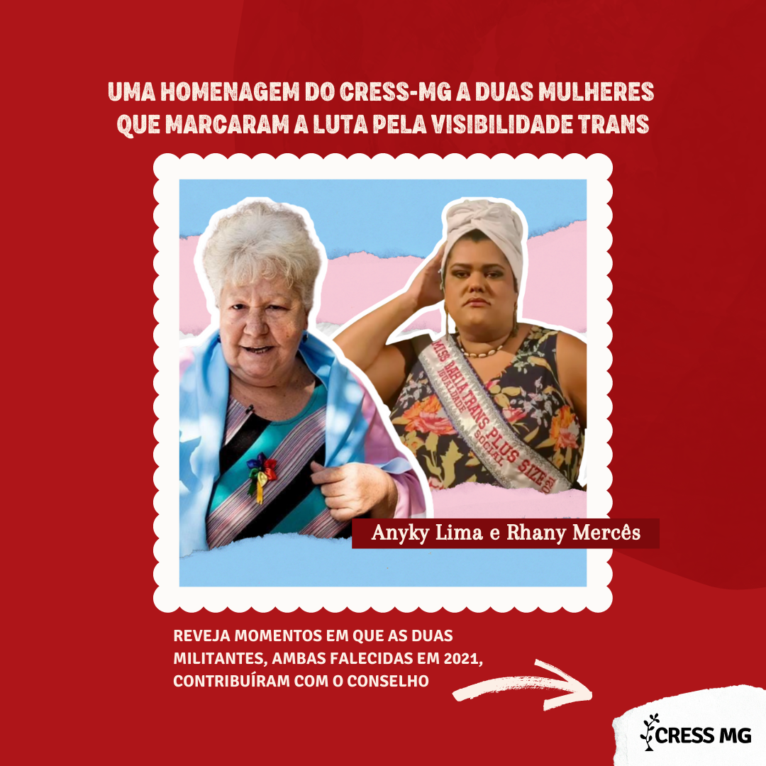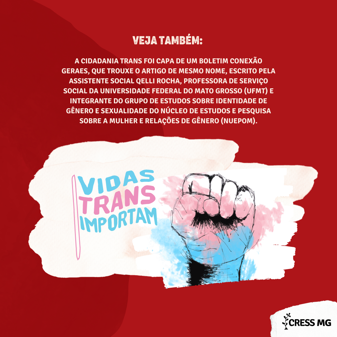 Na semana em que se comemora o Dia da Visibilidade Trans, 29 de janeiro, o CRESS-MG homenageia essas importantes figuras, lembrando que no país que mais mata pessoas trans, é dever das e dos assistentes sociais, “exercer o Serviço Social sem sofrer discriminação nem discriminar por questões de inserção de classe social, gênero, etnia, religião, nacionalidade, orientação sexual, identidade de gênero, idade e condição física”, conforme preconiza o Código de Ética.