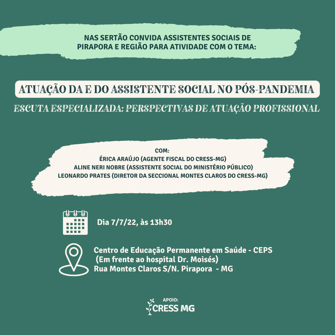 Alô, assistente social de Pirapora e região! Nesta quinta-feira, 7/7, tem atividade presencial do NAS Sertão sobre “Atuação da e do assistente social no pós-pandemia”.
