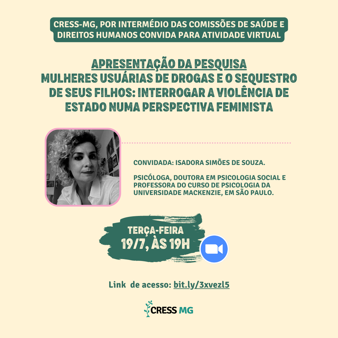 A próxima roda de conversa do CRESS-MG, promovida pelas Comissões de Saúde e Direitos Humanos, será marcada pela apresentação da pesquisa ? Mulheres Usuárias de Drogas e o Sequestro de Seus Filhos: Interrogar a Violência de Estado Numa Perspectiva Feminista.