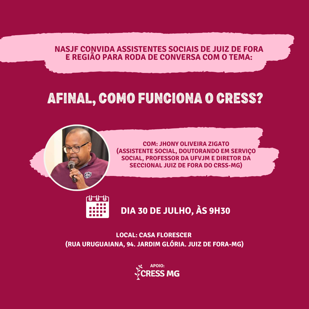 “Afinal, como funciona o CRESS?” Este é o tema da roda de conversa do NASJF, que acontecerá neste sábado (30/7), às 9h30.
