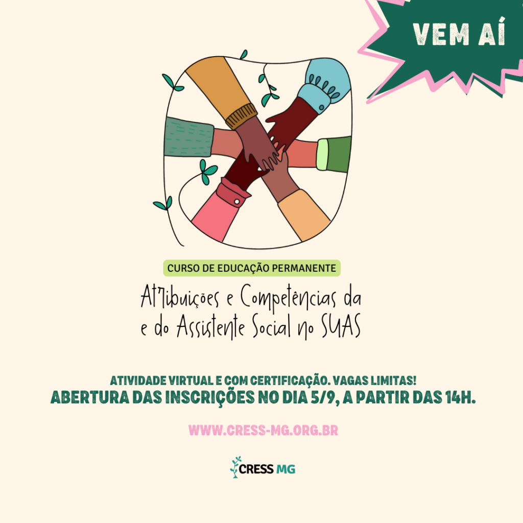 Na segunda que vem, 05/09, abriremos as inscrições para a 1ª edição do Curso “Atribuições e competências da e do Assistente Social no SUAS”.