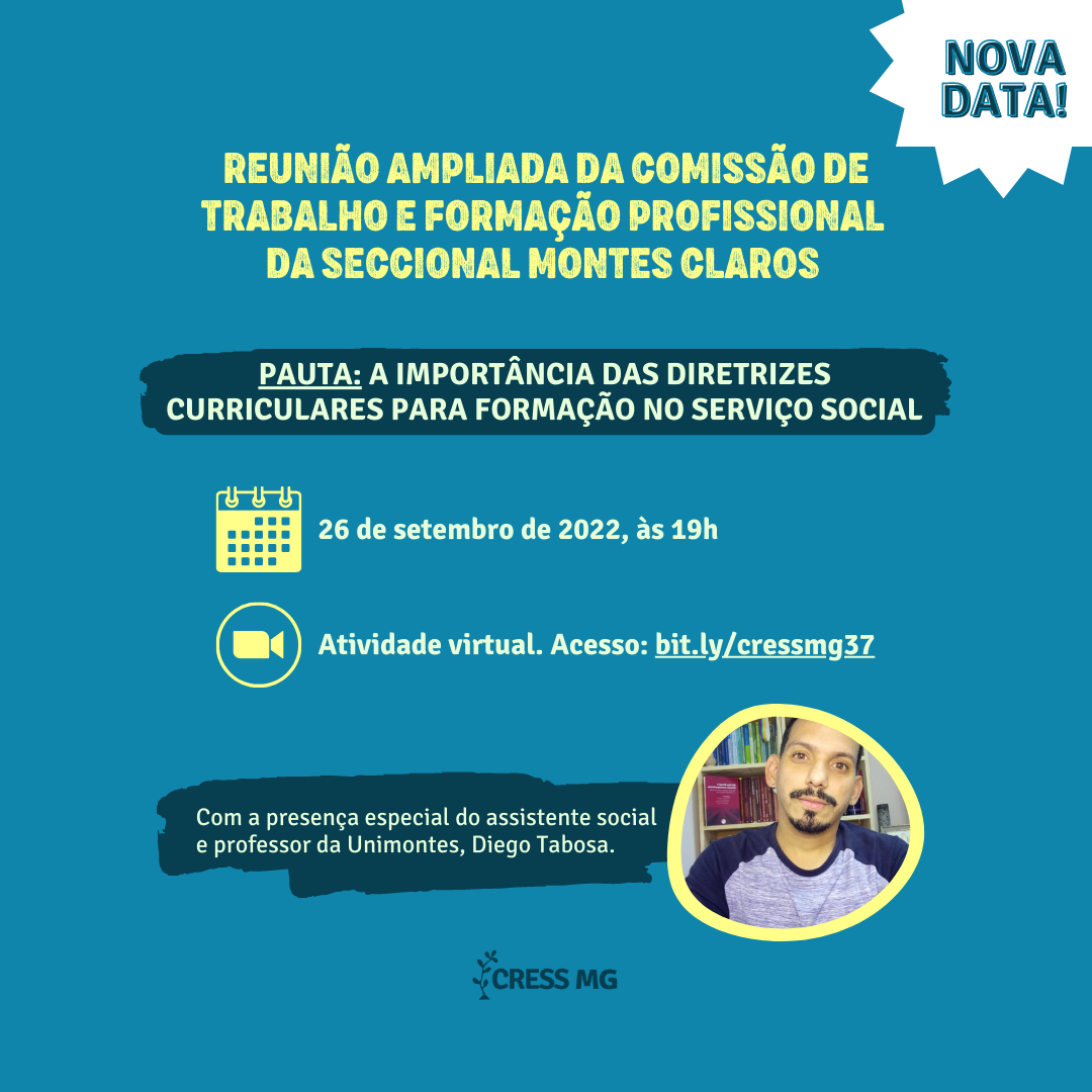 Na segunda-feira que vem (26/9), às 19h, tem reunião ampliada da Comissão de Trabalho e Formação Profissional da Seccional Montes Claros do CRESS-MG!