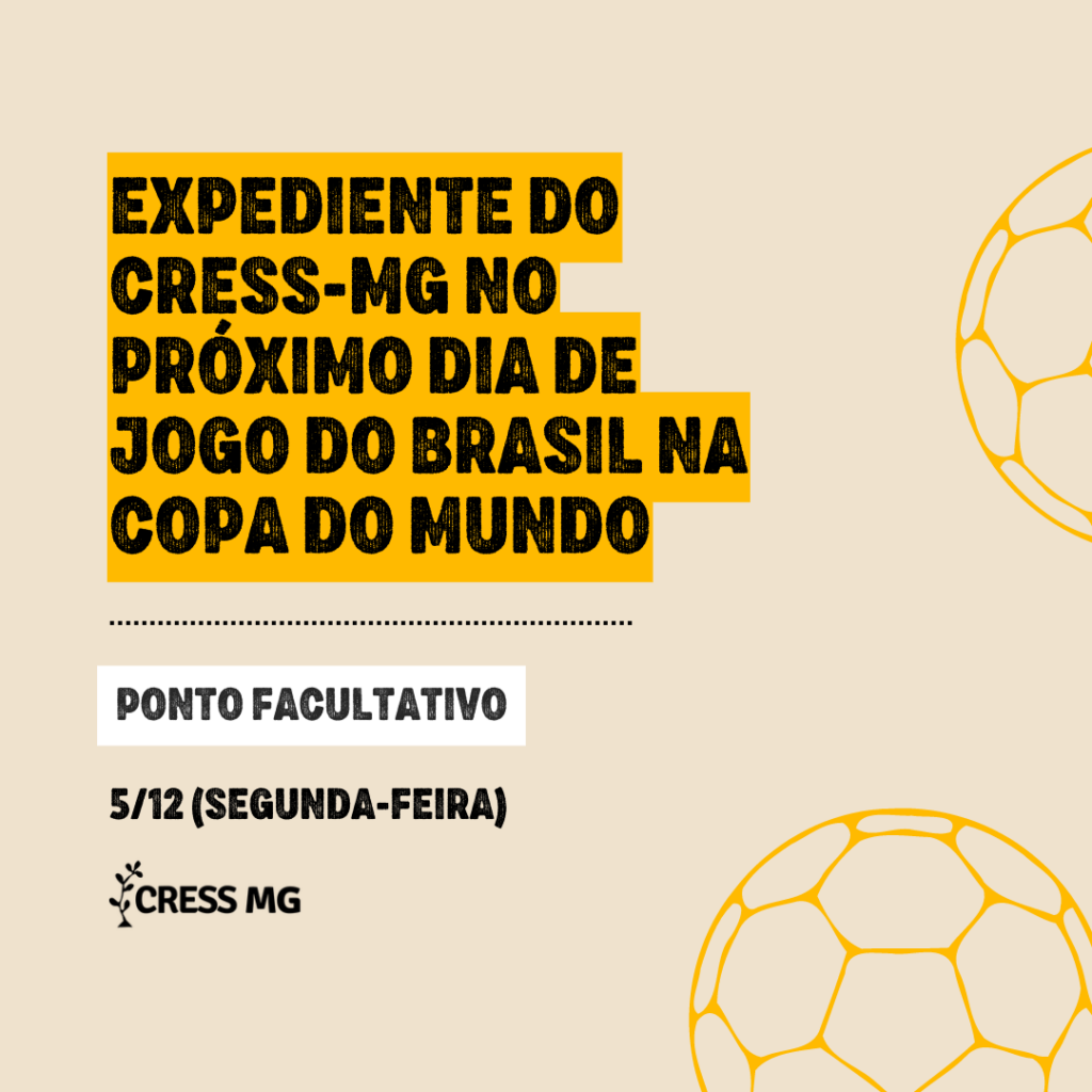 Nesta segunda-feira, dia 5/12, em virtude do jogo da Seleção Brasileira na Copa do Mundo, não haverá expediente na Sede do CRESS-MG, em Belo Horizonte, e nas Seccionais Juiz de Fora, Montes Claros e Uberlândia.