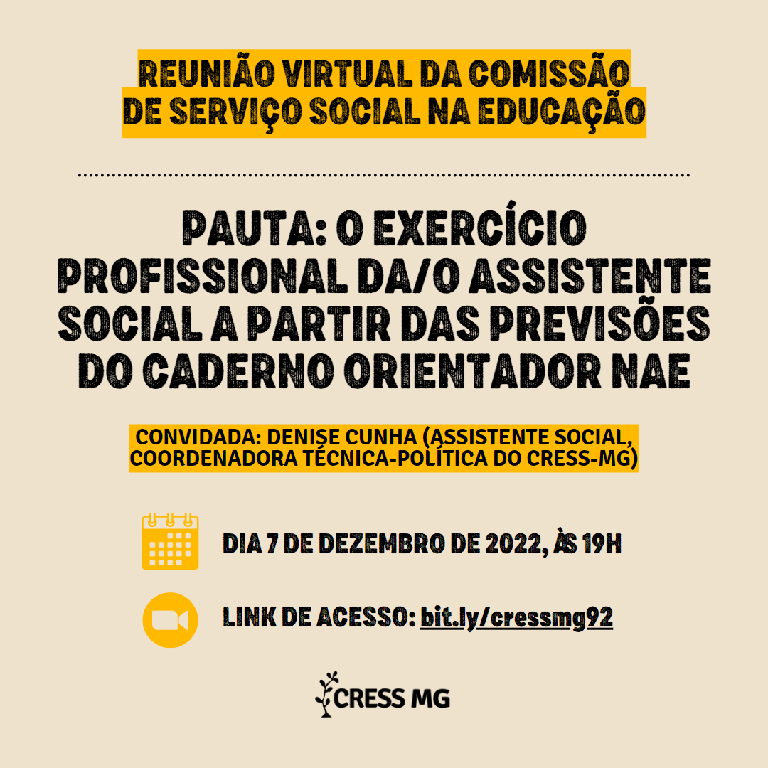 O principal ponto de pauta do encontro será sobre O Exercício Profissional da/o Assistente Social a Partir das Previsões do Caderno Orientador NAE e, para qualificar ainda mais o debate, a comissão convidou a assistente social e coordenadora técnica-administrativa do CRESS-MG, Denise Cunha.