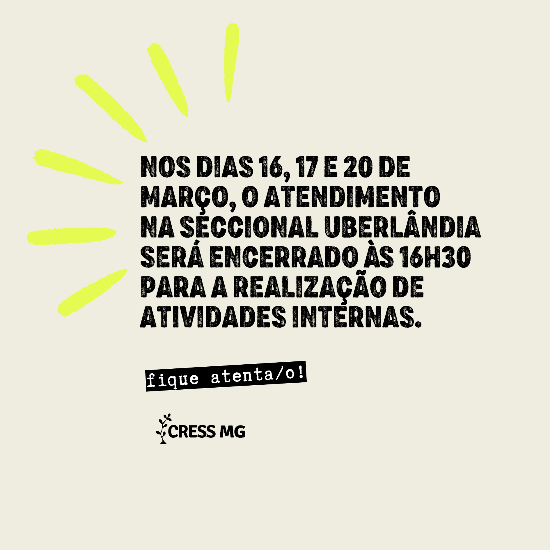 Nos dias 16, 17 e 20 de março, o atendimento na Seccional Uberlândia será encerrado às 16h30 para a realização de atividades internas.