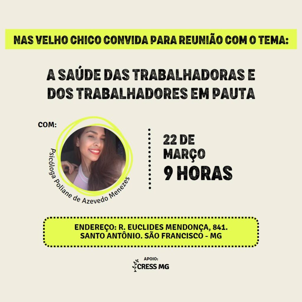 Dia 22 de março tem reunião importante do Núcleo de Assistentes Sociais Velho Chico sobre a saúde das trabalhadoras e dos trabalhadores.